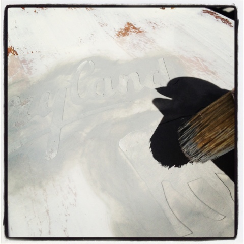 OK, I got so excited that I missed some steps in my pics.  After the chipping started I sanded off the chips and got the chairs down to a smooth finish.  Then I decided that the "so called barn" I found these old chairs in would be a Dairy Barn … yeah, that's it! So out comes my Dairyland Stencil!